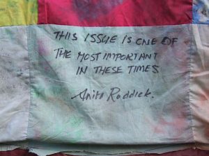 Anita Roddick – Founder of The Body Shop, who contributed this patchwork square to SPEAK’s Big Dress Campaign in 2005